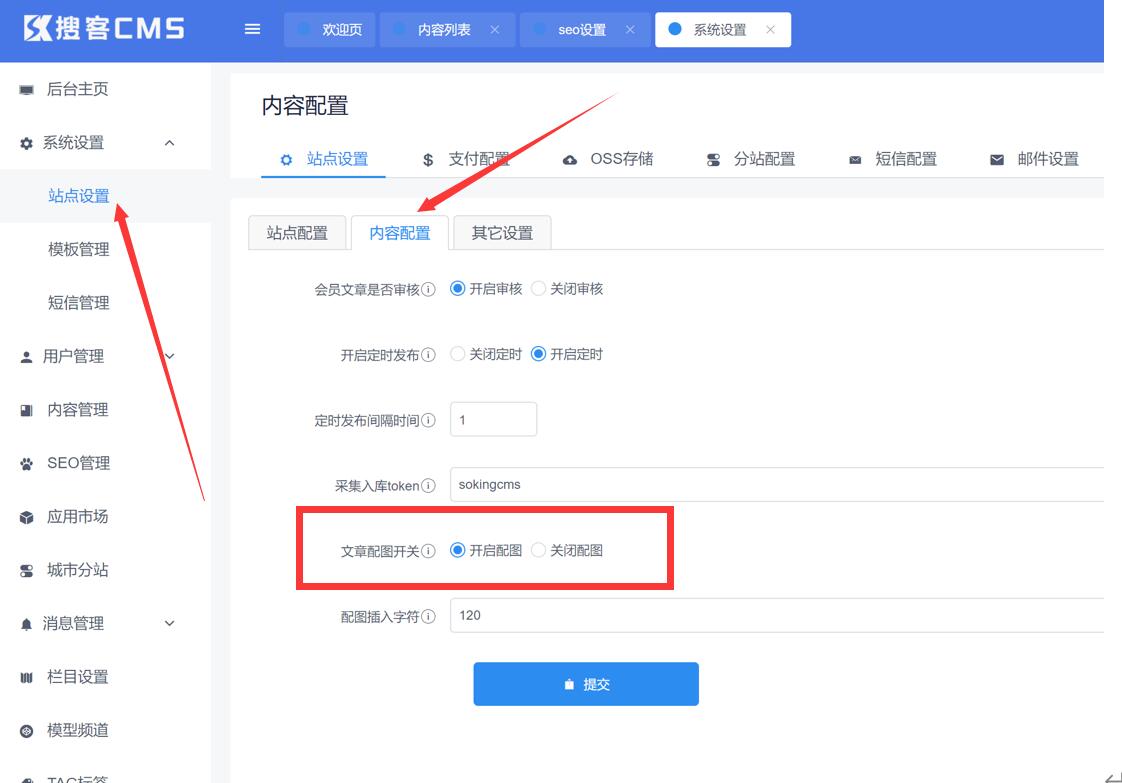 登陆网站后台站点设置找到内容配置(文章配图开关)选择开启即可